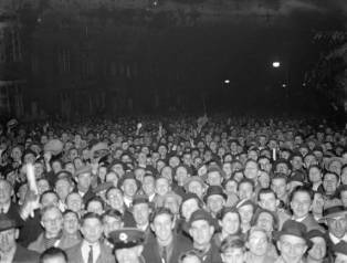 The Daily Mirror reported on 1st December: With flames rising to a height of 500 feet, streams of molten glass forcing back firemen and sparks being hurled three miles… Millions watched the fire. It could be seen in Brighton, fifty miles away. An air liner pilot in mid-Channel, eighty miles away, sighted the glow… For three miles around roads were completely blocked by cars. Many fire engines found it impossible to get within half a mile…The tremendous heat could be felt half a mile away. Firemen could not work near the flames for more than a minute. Several were injured and taken away. The noise as the roof crashed could be heard five miles away.