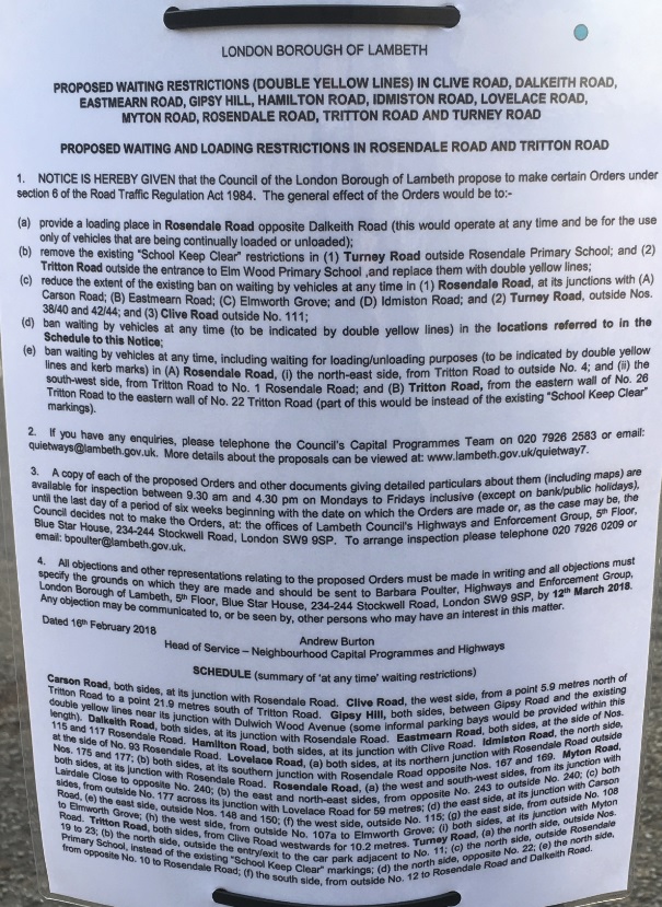 Lambeth has taken the decision to proceed with Quietway 7 from Thurlow Park to Gipsy Hill (see December 2017 decision details). This will link with Southwark’s Q7 route to Crystal Palace. There is now the statutory consultation with Traffic order notices (as seen pts-quietway-7) and on some Lamp posts running from 16th February 2018 until 12th March 2018**