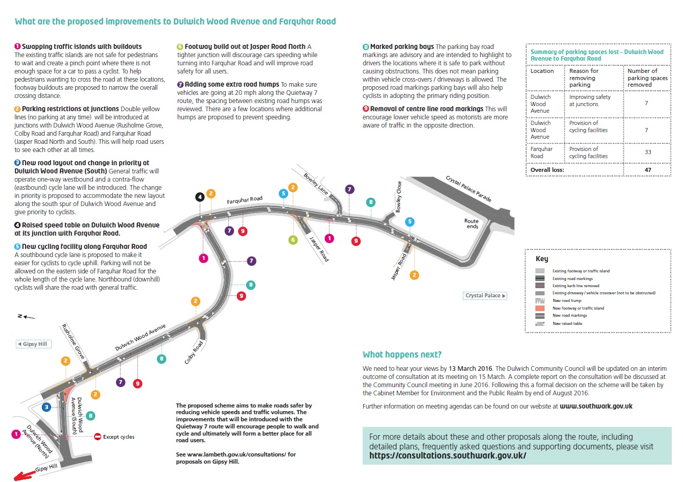 Opportunity to comment on draft designs were made in 2017 in workshops and meetings. See www.lambeth.gov.uk/quietway7 for full details of the proposed design, that covers the Lambeth route in both Thurlow Park Ward and Gipsy Hill Ward. The design proposals are in two parts: 01-05 and 06-10. Southwark are expecting Quietway 7 cycle route via Dulwich Wood Avenue, connecting with Crystal Palace. Feedback from this design review will inform a future statutory public consultation on the Lambeth section, that’s expected early in the new year. The proposed detailed design at Gipsy Hill is here: 2017-Design-Pack Pages 06-to-10 (GIPSY HILL PAGES) .