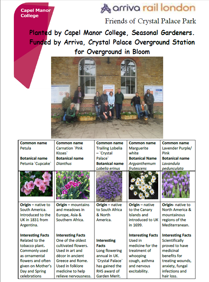 The project was part of “Overground in Bloom” from arriva rail. They are both the network rail provider and managers of our Grade II listed Crystal Palace station. This competition is hotly contested and judged all across Overground stations! This year, Crystal Palace Station is proudly in the contention! And, it now has new station partners for this and future community projects with Capel Manor College and Friends of Crystal Palace Park, after an epic “Park Nights” event hosted by Crystal Palace Transition Town !